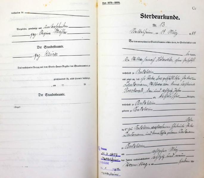 | aktuell | 13:21, 11. Mär. 2012 | 1.225 × 1.797, 51 Seiten (10,65 MB) | KlausErdmann (Diskussion • Beiträge) | {{Information |Beschreibung = ;Bürgermeisterei Nettesheim, Sterbe-Register von 1889 |Quelle = Gemeindearchiv Rommerskirchen |Urheber = |Datum = 1889 |Scans = Klaus Erdmann ''(Reproduktion: (8. |