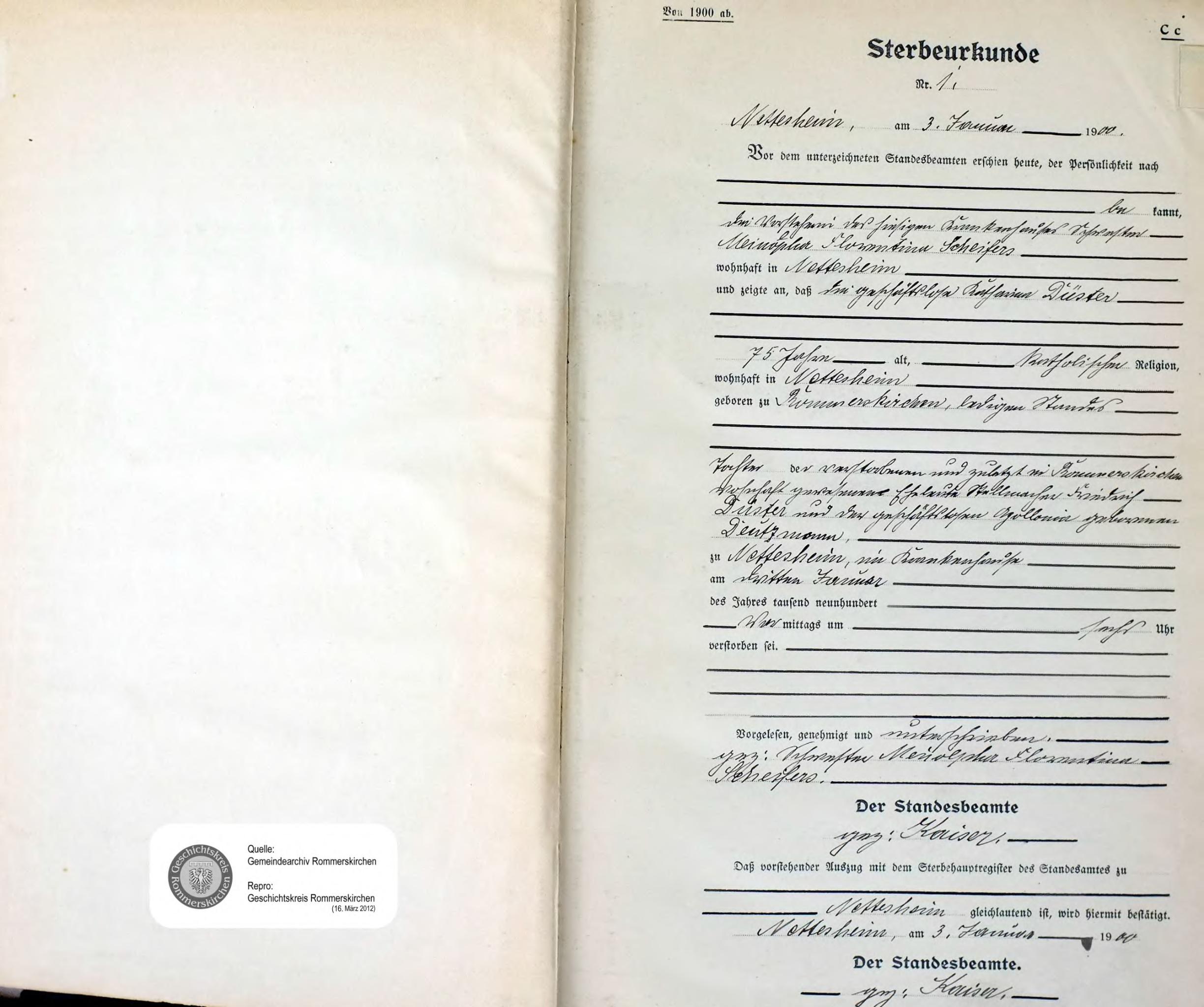| aktuell | 19:43, 17. Mär. 2012 | 1.786 × 2.310, 48 Seiten (11,08 MB) | KlausErdmann (Diskussion • Beiträge) | {{Information |Beschreibung = ;Standesamt Nettesheim, Sterbe-Register von 1900 |Quelle = Gemeindearchiv Rommerskirchen |Urheber = |Datum = 1900 |Scans = Klaus Erdmann ''(Repro: 16.März 2012)'' |