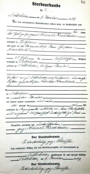 aktuell14:17, 18. Apr. 2012Vorschaubild der Version vom 14:17, 18. Apr. 20121.257 × 2.440 (219 KB)KlausErdmann (Diskussion • Beiträge){{Information |Beschreibung = Standesamt Nettesheim, ;Sterbeurkunde Nr.3 von 1909 |Quelle = Gemeindearchiv Rommerskirchen |Urheber = |Datum = 1909 |Scans = Klaus Erdmann ''(Repro: 12. April 201