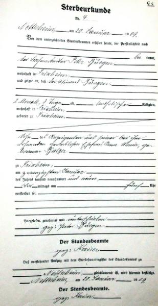 | aktuell | 14:19, 18. Apr. 2012 | 1.257 × 2.440 (202 KB) | KlausErdmann (Diskussion • Beiträge) | {{Information |Beschreibung = Standesamt Nettesheim, ;Sterbeurkunde Nr.4 von 1909 |Quelle = Gemeindearchiv Rommerskirchen |Urheber = |Datum = 1909 |Scans = Klaus Erdmann ''(Repro: 12. April 201 |