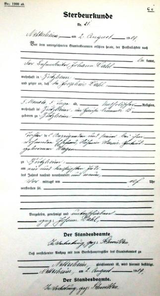 | aktuell | 17:20, 18. Apr. 2012 | 1.340 × 2.484 (211 KB) | KlausErdmann (Diskussion • Beiträge) | {{Information |Beschreibung = Standesamt Nettesheim, ;Sterbeurkunde Nr. 21 von 1909 |Quelle = Gemeindearchiv Rommerskirchen |Urheber = |Datum = 1909 |Scans = Klaus Erdmann ''(Repro: 12. April 2 |