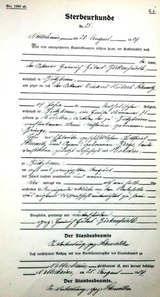 | aktuell | 17:15, 18. Apr. 2012 | 1.346 × 2.490 (241 KB) | KlausErdmann (Diskussion • Beiträge) | {{Information |Beschreibung = Standesamt Nettesheim, ;Sterbeurkunde Nr. 25 von 1909 |Quelle = Gemeindearchiv Rommerskirchen |Urheber = |Datum = 1909 |Scans = Klaus Erdmann ''(Repro: 12. April 2 |