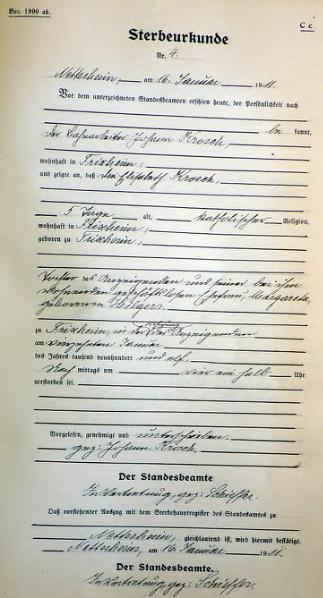 | aktuell | 09:30, 25. Jan. 2013 | 1.881 × 2.511, 53 Seiten (5,83 MB) | KlausErdmann (Diskussion • Beiträge) | {{Information |Beschreibung = ;Standesamt Nettesheim, Sterberegister von 1911 |Quelle = Archiv im Rhein-Kreis Neuss |Urheber = |Datum = 1911 |Scans = Klaus Erdmann ''(Repro: 24. Januar 2 |