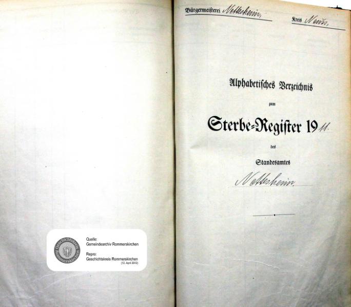 | aktuell | 13:06, 15. Apr. 2012 | 1.881 × 2.511, 4 Seiten (2,33 MB) | KlausErdmann (Diskussion • Beiträge) | {{Information |Beschreibung = Standesamt Nettesheim, ;Alphabtisches Verzeichnis zum Sterbe-Register 1911 |Quelle = Gemeindearchiv Rommerskirchen |Urheber = |Datum = 1911 |Scans = Klaus Erdmann |