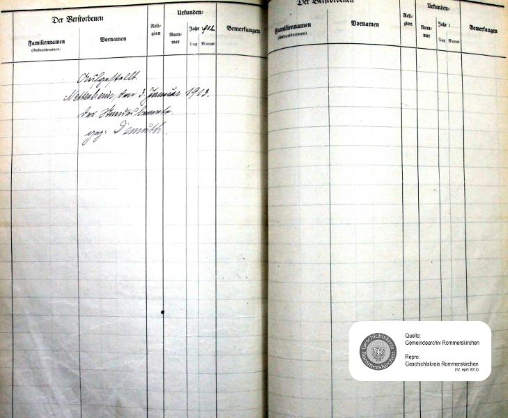 | aktuell | 13:11, 15. Apr. 2012 | 1.881 × 2.511, 4 Seiten (1,38 MB) | KlausErdmann (Diskussion • Beiträge) | {{Information |Beschreibung = Standesamt Nettesheim, ;Alphabetisches Verzeichnis zum Sterbe-Register 1912 |Quelle = Gemeindearchiv Rommerskirchen |Urheber = |Datum = 1912 |Scans = Klaus Erdmann |