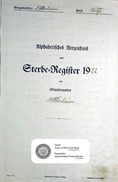 | aktuell | 10:10, 8. Mai 2013 | 1.625 × 2.252, 19 Seiten (5,8 MB) | KlausErdmann (Diskussion • Beiträge) | {{Information |Beschreibung = ;Standesamt Nettesheim, Sterberegister von 1922 |Quelle = Archiv im Rhein-Kreis Neuss |Urheber = |Datum = 1922 |Scans = Klaus Erdmann ''(Repro: 7. Mai 2013) |