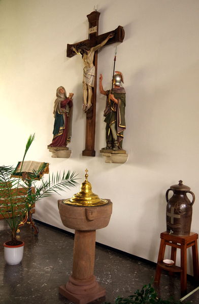 Das Taufbecken vor der Kreuzigungsgruppe in der kath. Kirche St. Martin, Nettersheim | |||