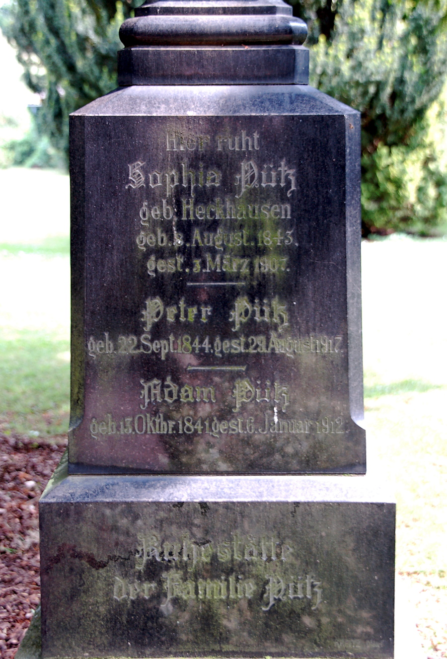 Inschrift der Grabstätte der Familie Pütz auf dem Alten Friedhof an der St. Martinuskirche in Rommerskirchen-Nettesheim | ||||