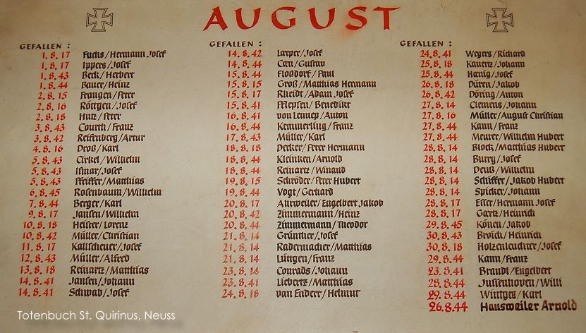 - Beschreibung: Das Totenbuch (August) für die Gefallenen der beiden Weltkriege im St. Quirinus-Münster, Neuss.