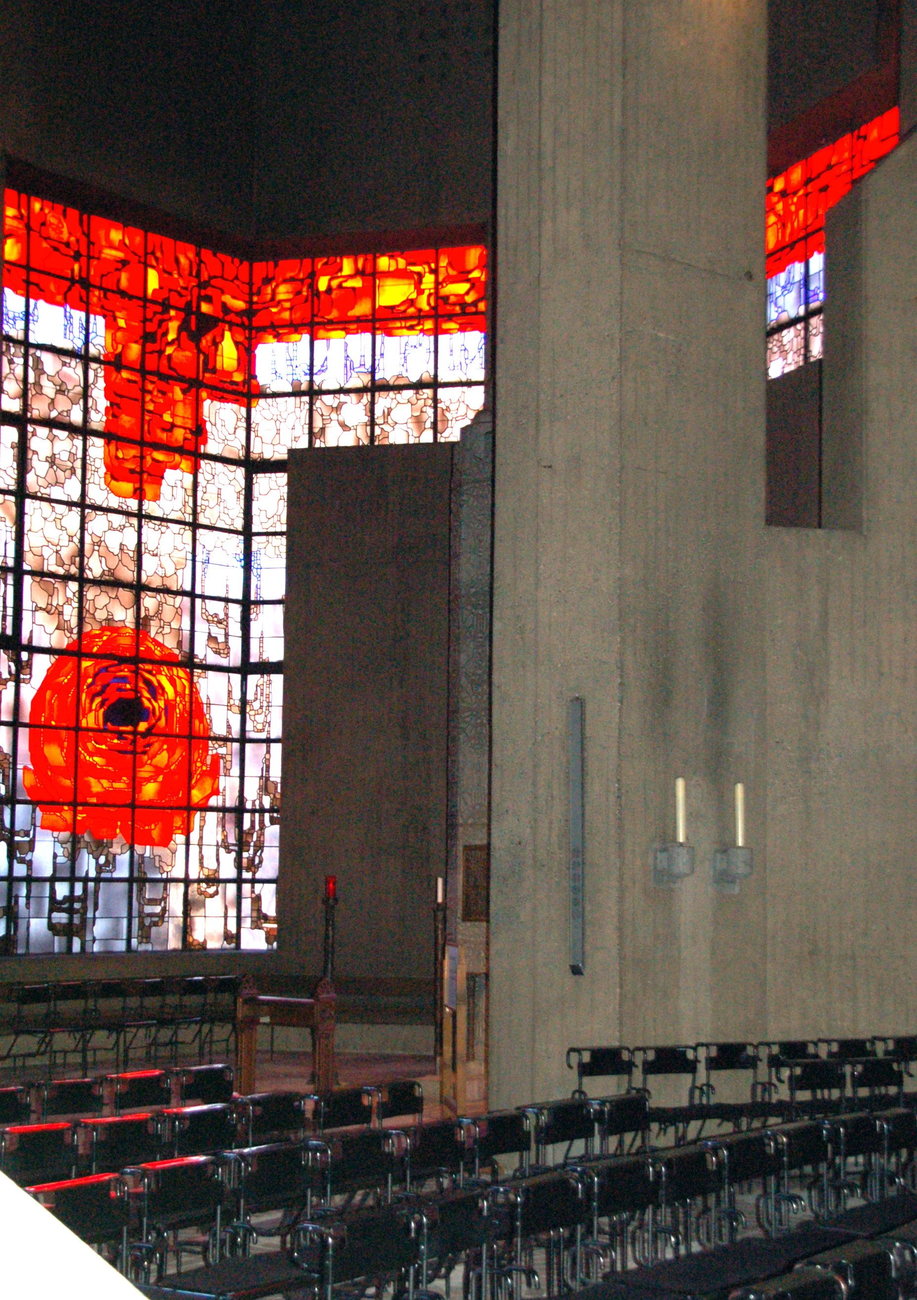 Das Rosenfenster (links) in der Sakramentskapelle der Wallfahrtskirche (Mariendom) in Neviges
