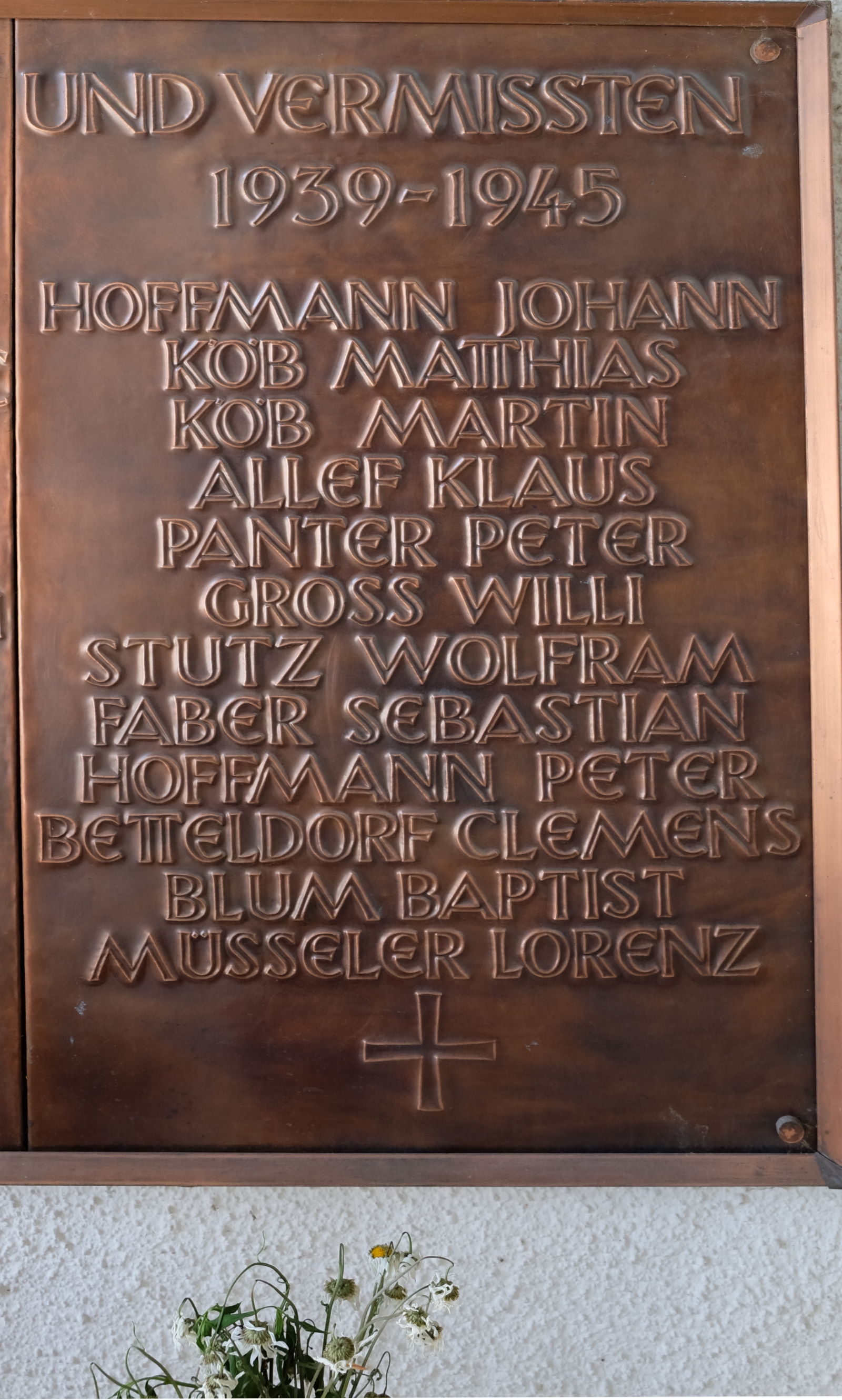 rechte Gedenktafel der Gedenkstätte für die Kriegsopfer in der Trauerhalle auf dem Friedhof an der Klosterkirche von Niederehe | ||||
