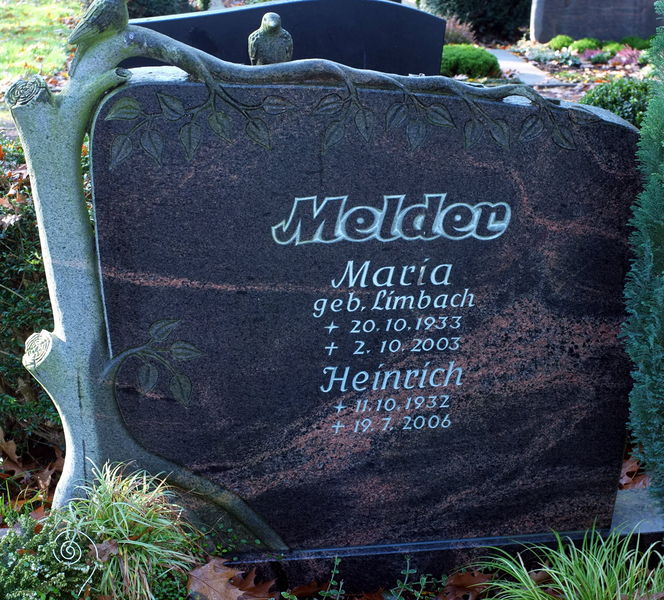 | aktuell | 08:56, 22. Nov. 2014 | 1.600 × 1.445 (698 KB) | KlausErdmann (Diskussion • Beiträge) | {{Information |Beschreibung = Grabstein auf dem Friedhof von Oekoven ;Maria Melder, geb. Limbach 1933-2003 ;Heinrich Melder 1932-2006 |Quelle = selbst fotografiert |Urheber = Kateer Nov. 2014 |Datum = |Scans = |