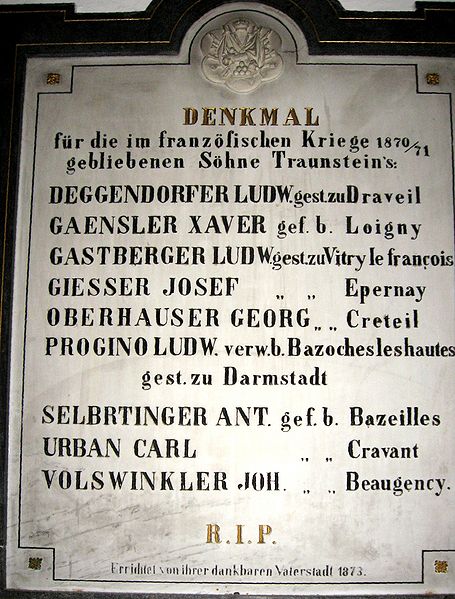 | aktuell | 17:34, 7. Jan. 2012 | 1.702 × 2.241 (2,81 MB) | Agrum (Diskussion • Beiträge) | {{Information |Beschreibung = Opfer des Krieges 1870/71 aus Traunstein |Quelle = eigenes Foto |Urheber = August G. Rumpenhorst |Datum = 07. 01. 2012 |Scans = |Genehmigung = |Andere_Versionen = |Anmerkungen = {{Ge}}o|47.869553 |