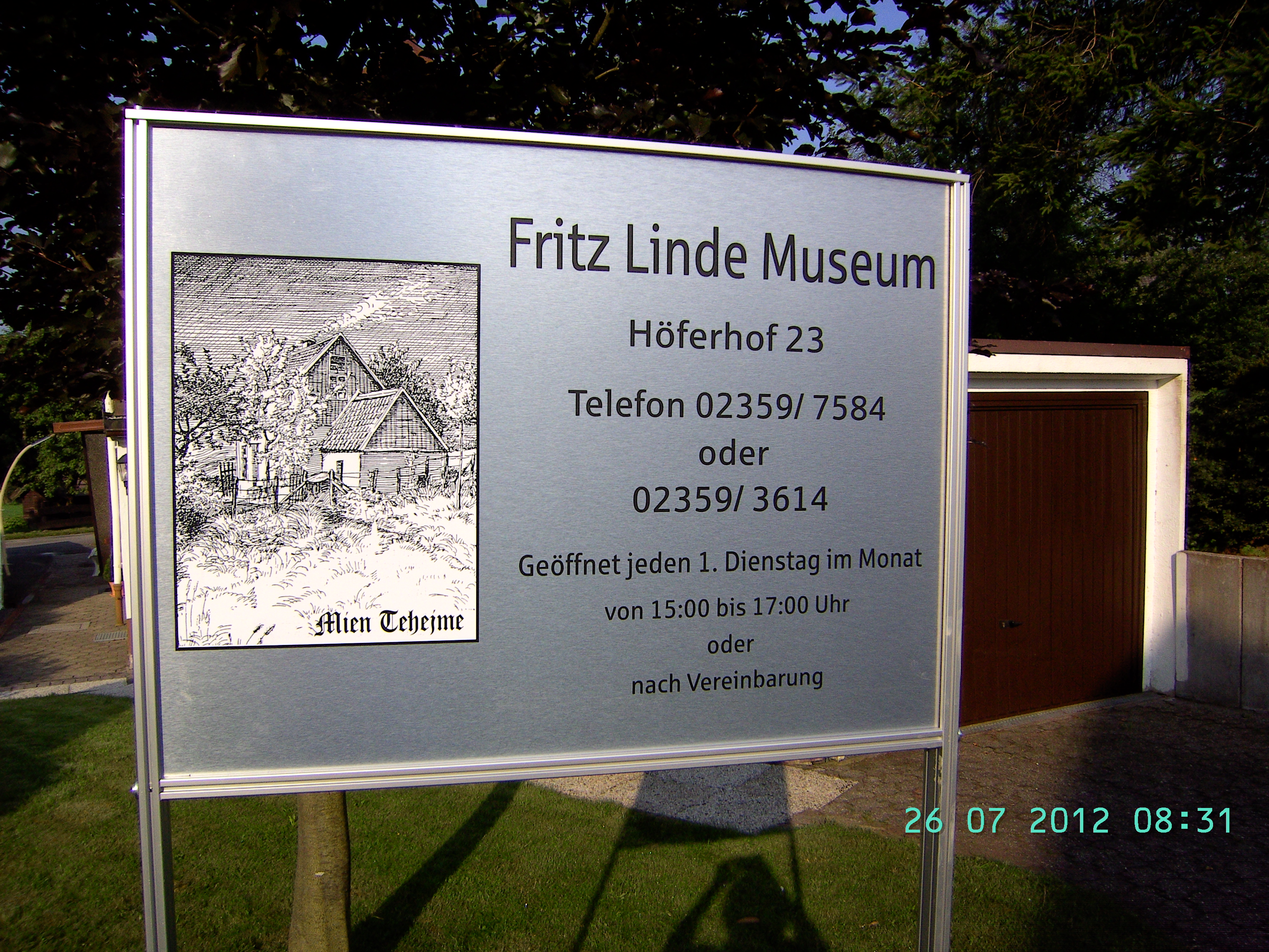Hinweisschild des Fritz-Linde-Museums am Höferhof 23