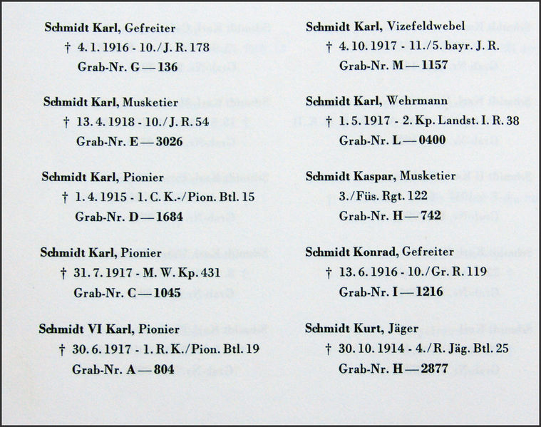 | aktuell | 18:41, 3. Dez. 2014 | 1.532 × 1.210 (1,65 MB) | Peterga (Diskussion • Beiträge) | *Beschreibung: Gedenkbucheintrag von Karl Schmidt auf der Kriegsgräberstätte Menen *Quelle: Hans Lesage, http://www.weltkriegsgraeber.be/ *Fotograf oder Zeichner(in): Hans Lesage, http://www.weltkriegsgraeber.be/ mit freundlicher Erlaubnis {{Copyright |