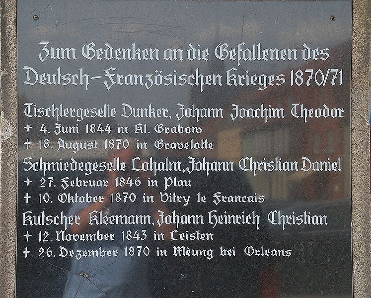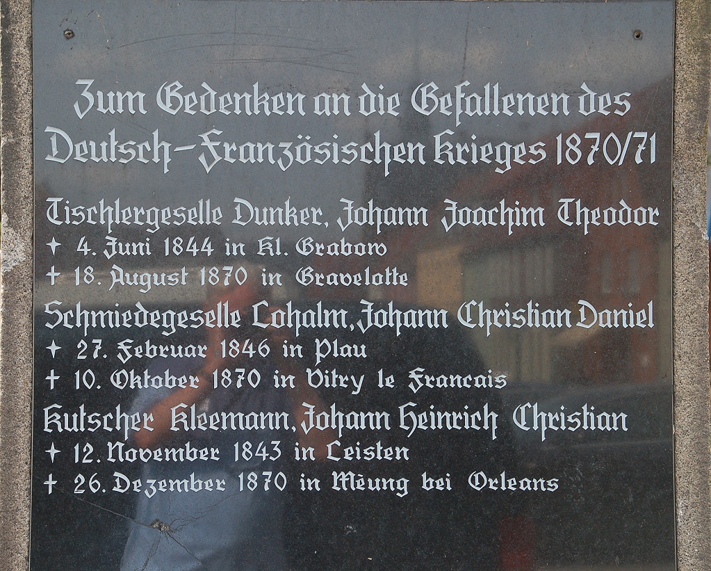Mahnmal zum Gedenken an die Gefallenen des deutsch-französischen Krieges 1870/71 an der Marienkirche zu Plau am See; | |||