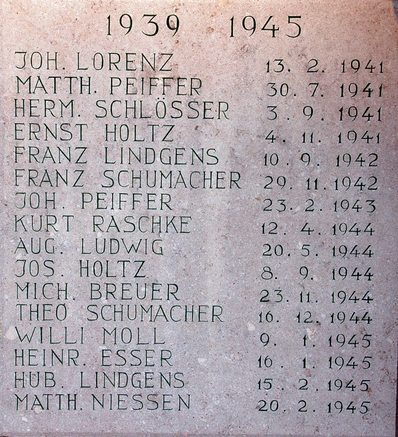 Gedenktafel 1939-1945 am Ehrenmal für die Opfer der beiden Weltkriege in Pütz (Bedburg/Erft) | ||||