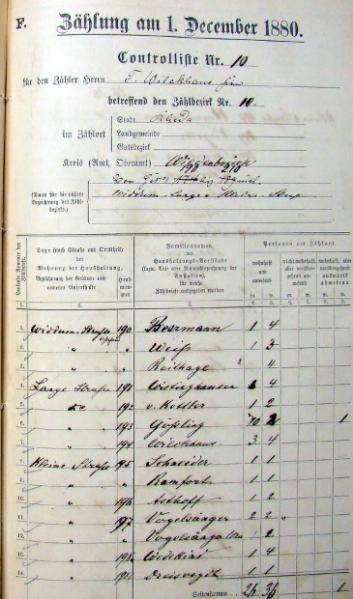 Kontrolliste zur Volkszählung vom 1. Dezember 1880 im Königreich Preußen |