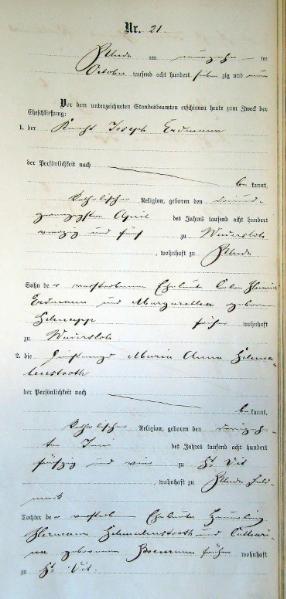 | aktuell | 19:06, 17. Feb. 2011 | 1.109 × 2.326, 2 Seiten (523 KB) | KlausErdmann (Diskussion • Beiträge) | {{Information |Beschreibung = ;Standesamt Rheda:Heiratsurkunde von 1879, Nr.21 *Joseph Erdmann *Maria Anna Schmalenstroth |Quelle = Standesamt Rheda-Wiedenbrück |Urheber = |Datum = 1879 |Scans = Klaus Erdmann ''(Repro: 16. Febr. 2 |