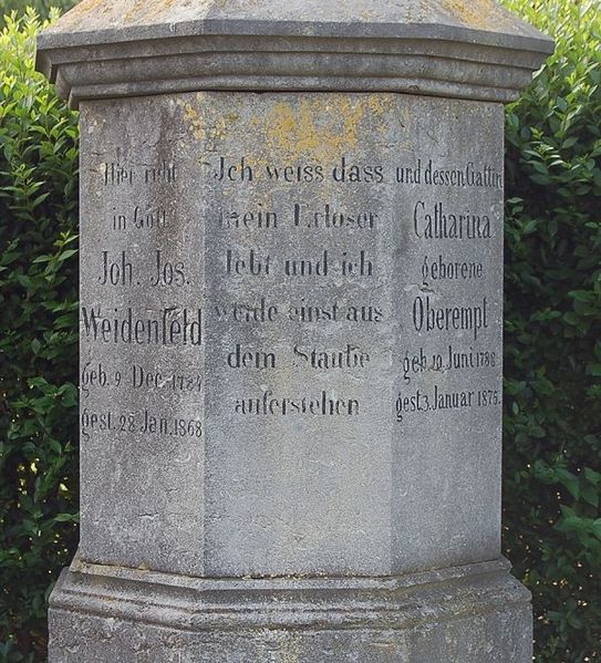 | aktuell | 08:50, 6. Jun. 2009 | 600 × 662 (116 KB) | KlausErdmann (Diskussion • Beiträge) | {{Information |Beschreibung = Grabmal auf dem alten Friedhof in Rommerskirchen<br /> '''Ruhestätte der Eheleute Joh. Jos. Weidenfeld & Catharina Oberembt''' |Quelle = selbst fotografiert |Urheber = Kateer 6 J |