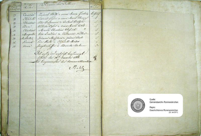 | aktuell | 13:49, 29. Jul. 2011 | 1.374 × 1.870, 21 Seiten (9,75 MB) | KlausErdmann (Diskussion • Beiträge) | {{Information |Beschreibung = ;Bürgermeisterei Rommerskirchen:Register der Geburts-Urkunden 1818 |Quelle = Gemeindearchiv Rommerskirchen |Urheber = |Datum = 1818 |Scans = Klaus Erdmann ''(Repr |