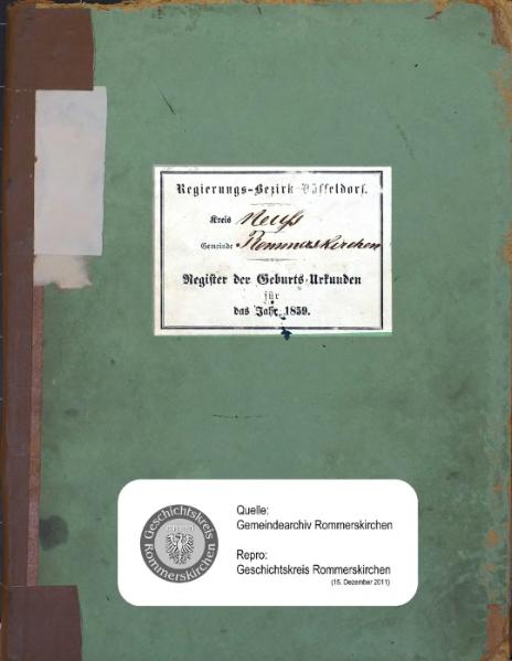 | aktuell | 11:04, 17. Dez. 2011 | 1.620 × 2.087, 41 Seiten (16,81 MB) | KlausErdmann (Diskussion • Beiträge) | {{Information |Beschreibung = ;Bürgermeisterei Rommerskirchen, Register der Geburts-Urkunden für das Jahr 1859 |Quelle = Gemeindearchiv Rommerskirchen |Urheber = |Datum = 1859 |Scans = [[User:KlausErdmann|Klaus Er |