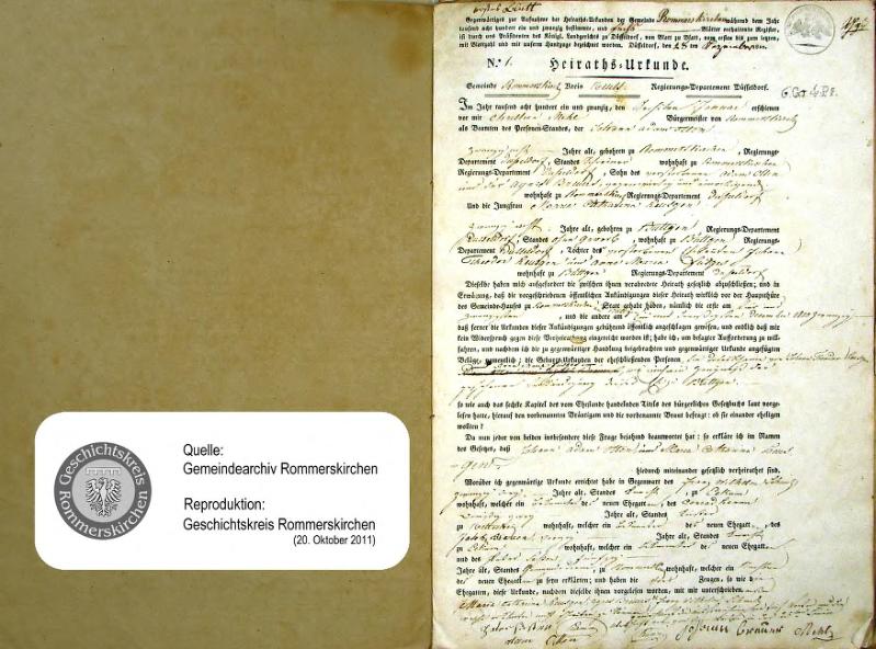 | aktuell | 09:07, 28. Okt. 2011 | 898 × 1.304, 13 Seiten (4,08 MB) | KlausErdmann (Diskussion • Beiträge) | {{Information |Beschreibung = ;Standesamt Rommerskirchen, Register der Heirats-Urkunden von 1821 |Quelle = Gemeindearchiv Rommerskirchen |Urheber = |Datum = 1821 |Scans = Klaus Erdmann ''(Repro |
