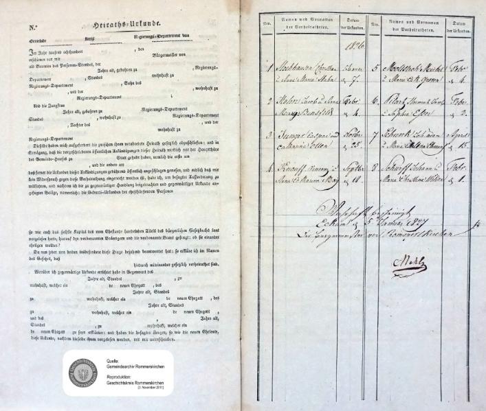 | aktuell | 16:14, 3. Nov. 2011 | 1.526 × 2.321, 7 Seiten (4 MB) | KlausErdmann (Diskussion • Beiträge) | {{Information |Beschreibung = ;Standesamt Rommerskirchen, Register der Heirats-Urkunden von 1827 |Quelle = Gemeindearchiv Rommerskirchen |Urheber = |Datum = 1826 |Scans = Klaus Erdmann ''(Repro |
