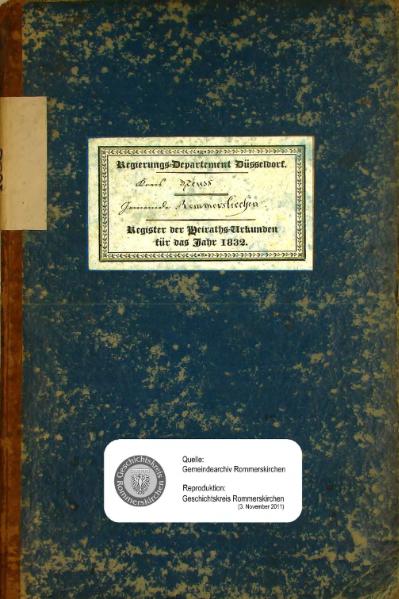 | aktuell | 08:07, 4. Nov. 2011 | 1.510 × 2.269, 10 Seiten (4,88 MB) | KlausErdmann (Diskussion • Beiträge) | {{Information |Beschreibung = ;Standesamt Rommerskirchen, Register der Heirats-Urkunden für das Jahr 1832 |Quelle = Gemeindearchiv Rommerskirchen |Urheber = |Datum = 1832 |Scans = [[User:KlausErdmann|Klaus Erdmann] |