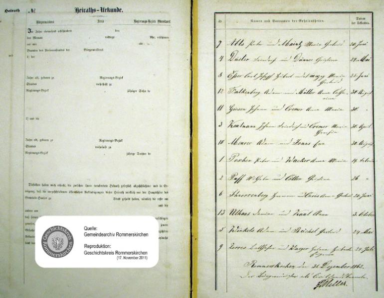 - Standesamt Rommerskirchen, Register der Heirats-Urkunden für das Jahr 1862