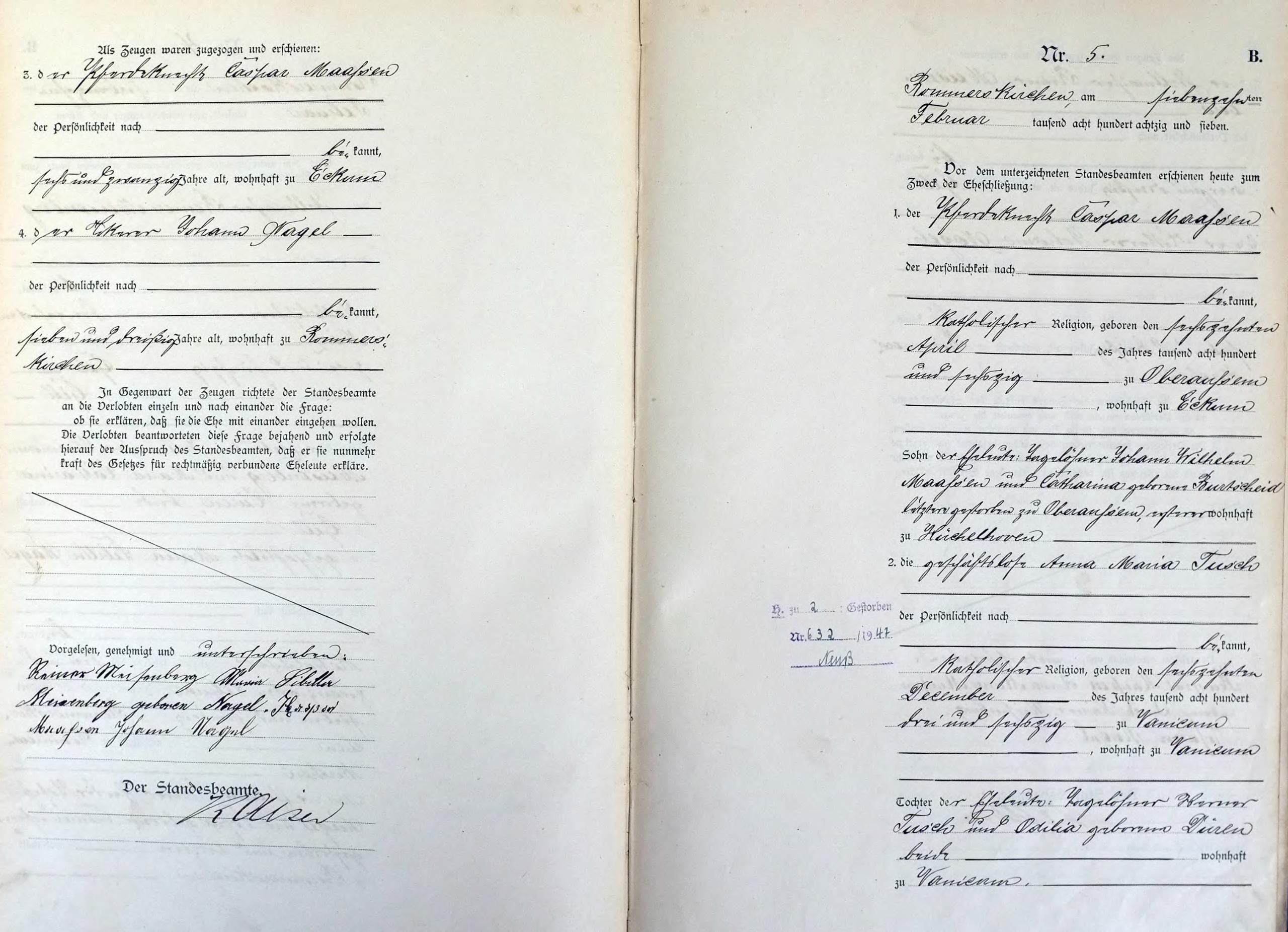 | aktuell | 11:58, 26. Nov. 2011 | 1.577 × 2.435, 18 Seiten (6,76 MB) | KlausErdmann (Diskussion • Beiträge) | {{Information |Beschreibung = ;Standesamt der Gemeinde Rommerskirchen, Register der Heirats-Urkunden für das Jahr 1887 |Quelle = Gemeindearchiv Rommerskirchen |Urheber = |Datum = 1887 |Scans = [[User:KlausErdmann|K |