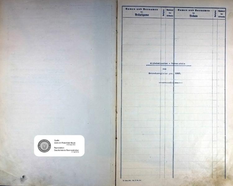 | aktuell | 14:33, 11. Apr. 2013 | 1.613 × 2.274, 3 Seiten (819 KB) | KlausErdmann (Diskussion • Beiträge) | {{Information |Beschreibung = ;Standesamt Rommerskirchen :Alphabetisches Namenverzeichnis zum Heiratsregister 1923 |Quelle = Archiv im Rhein-Kreis Neuss |Urheber = |Datum = 1923 |Scans = Klaus Erdmann ''(1 |
