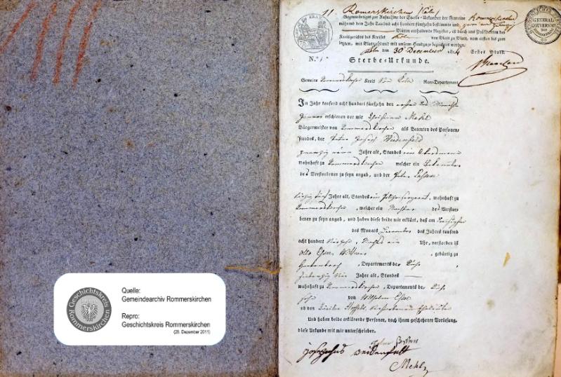| aktuell | 13:52, 28. Dez. 2011 | 1.292 × 1.819, 23 Seiten (6,86 MB) | KlausErdmann (Diskussion • Beiträge) | {{Information |Beschreibung = ;Bürgermeisterei Rommerskirchen, Sterbe-Urkunden 1815 |Quelle = Gemeindearchiv Rommerskirchen |Urheber = |Datum = 1815 |Scans = Klaus Erdmann ''(Repro: 28. Dezemb |