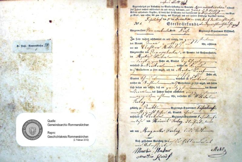 | aktuell | 18:36, 4. Feb. 2012 | 1.351 × 1.714, 24 Seiten (7,74 MB) | KlausErdmann (Diskussion • Beiträge) | {{Information |Beschreibung = ;Bürgermeisterei Rommerskirchen:Register der Sterbe-Urkunden für das Jahr 1841 |Quelle = Gemeindearchiv Rommerskirchen |Urheber = |Datum = 1841 |Scans = [[User:KlausErdmann|Klaus Erdm |
