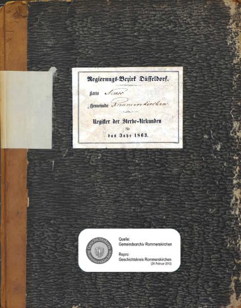 | aktuell | 18:29, 24. Feb. 2012 | 1.887 × 2.401, 26 Seiten (11,2 MB) | KlausErdmann (Diskussion • Beiträge) | {{Information |Beschreibung = ;Standesamt Rommerskirchen:Register der Sterbe-Urkunden für das Jahr 1863 |Quelle = Gemeindearchiv Rommerskirchen |Urheber = |Datum = 1863 |Scans = Klaus Erdmann ''(Repro: 24. Februar 2012)'' |Genehmi |