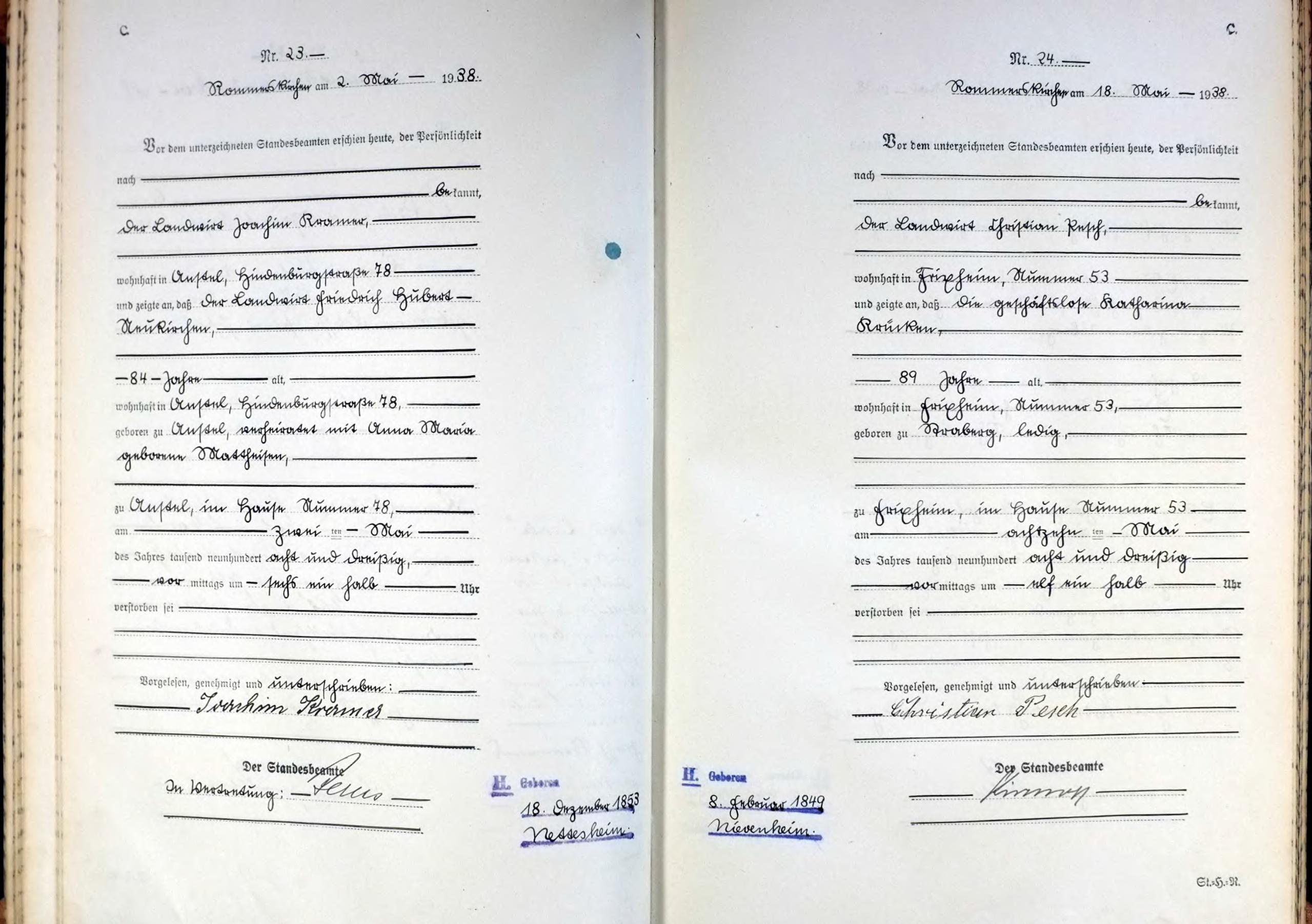| aktuell | 15:56, 15. Mai 2013 | 1.633 × 2.336, 19 Seiten (5,34 MB) | KlausErdmann (Diskussion • Beiträge) | {{Information |Beschreibung = ;Standesamt Rommerskirchen, Sterberegister von 1938 - Band 1 (Nr. 1-30) |Quelle = Archiv im Rhein-Kreis Neuss |Urheber = |Datum = 1938 |Scans = [[User:KlausErdmann|Klaus Erdm |