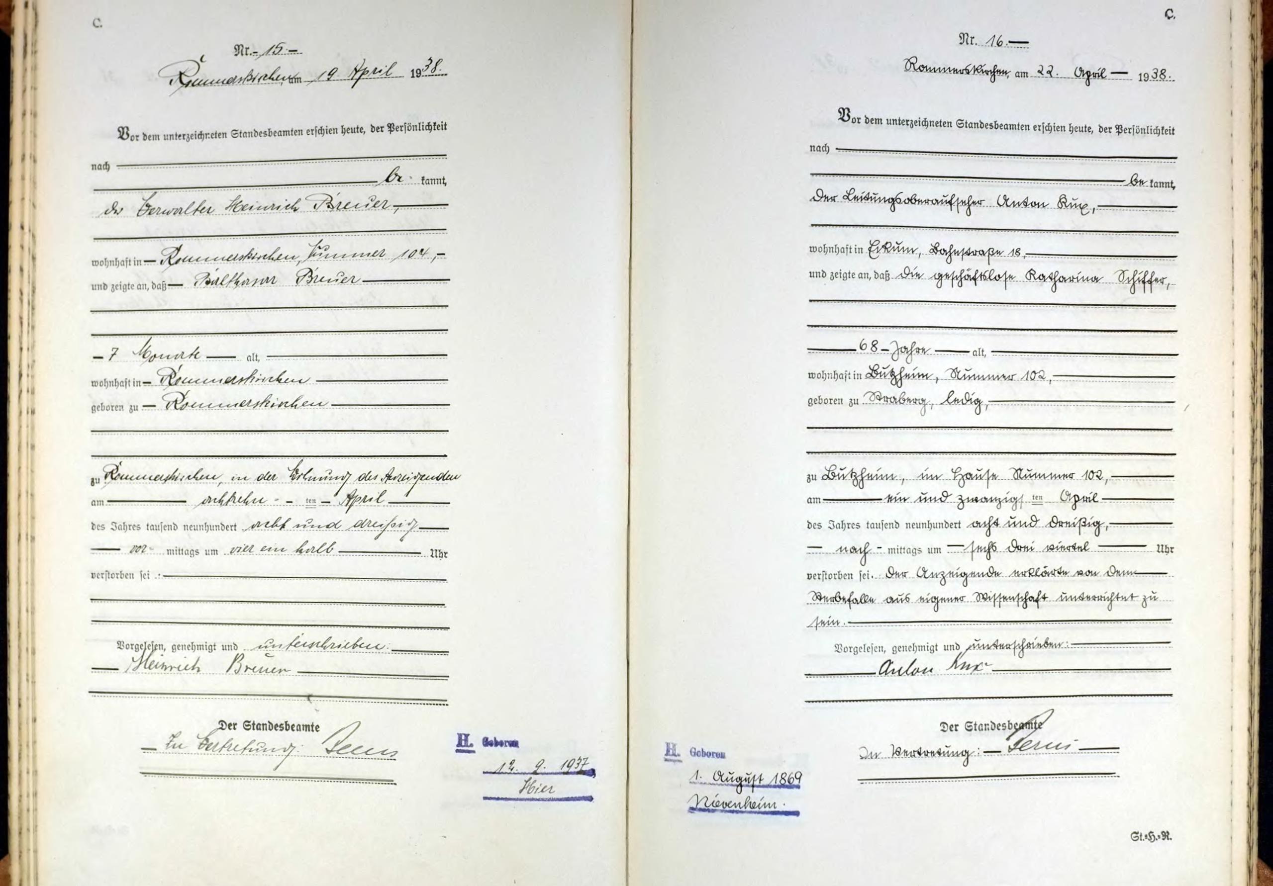 | aktuell | 15:56, 15. Mai 2013 | 1.633 × 2.336, 19 Seiten (5,34 MB) | KlausErdmann (Diskussion • Beiträge) | {{Information |Beschreibung = ;Standesamt Rommerskirchen, Sterberegister von 1938 - Band 1 (Nr. 1-30) |Quelle = Archiv im Rhein-Kreis Neuss |Urheber = |Datum = 1938 |Scans = [[User:KlausErdmann|Klaus Erdm |