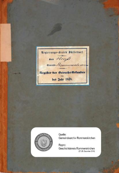 | aktuell | 14:45, 31. Dez. 2010 | 1.610 × 2.331, 20 Seiten (9,83 MB) | KlausErdmann (Diskussion • Beiträge) | {{Information |Beschreibung = ;Bürgermeisterei Rommerskirchen:Heiratsurkunden von 1858 |Quelle = Gemeindearchiv Rommerskirchen |Urheber = |Datum = 1858 |Scans = Klaus Erdmann ''(Repro: 29. Deze |