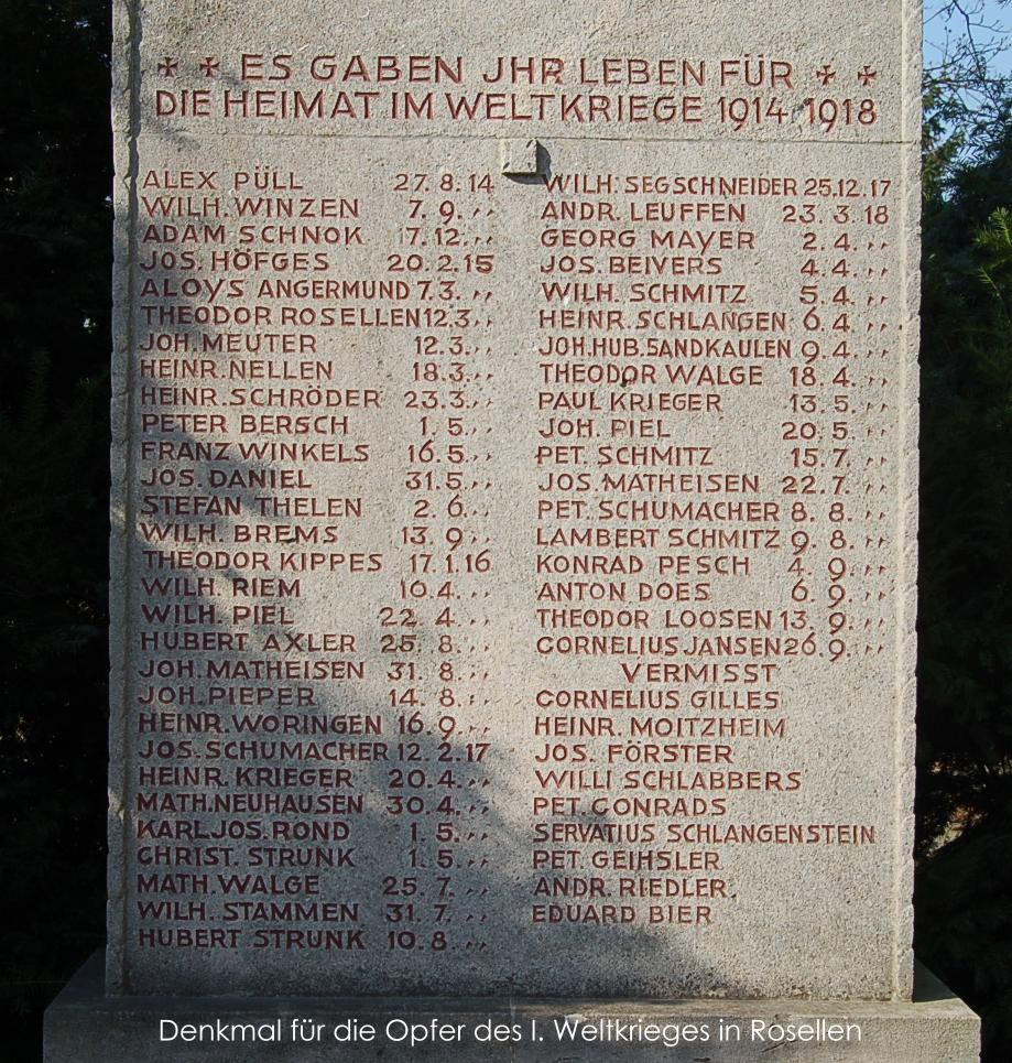 - Beschreibung: Tafel mit den Namen der Opfer des I.Weltkrieges am Denkmal an der kath. Pfarrkirche St. Peter in Neuss-Rosellen.