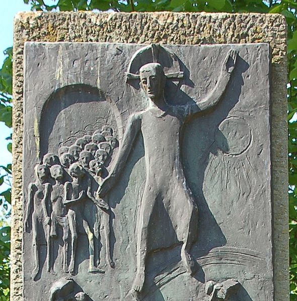 Oberes Detail des Bronzereliefs am Denkmal für die Opfer der beiden Weltkriege in St. Vit | |||