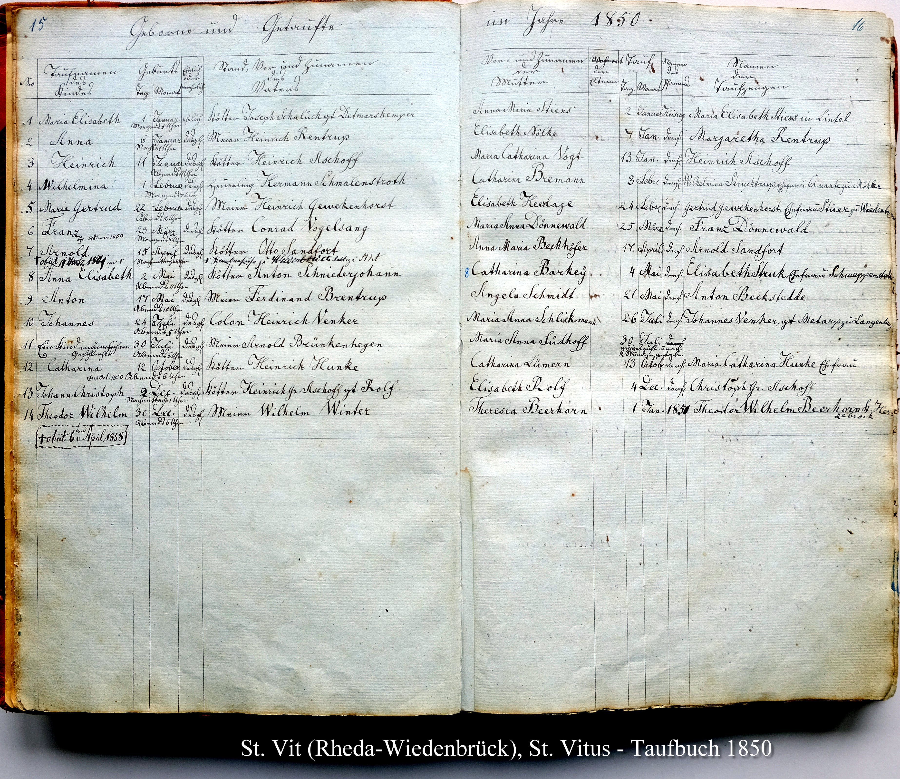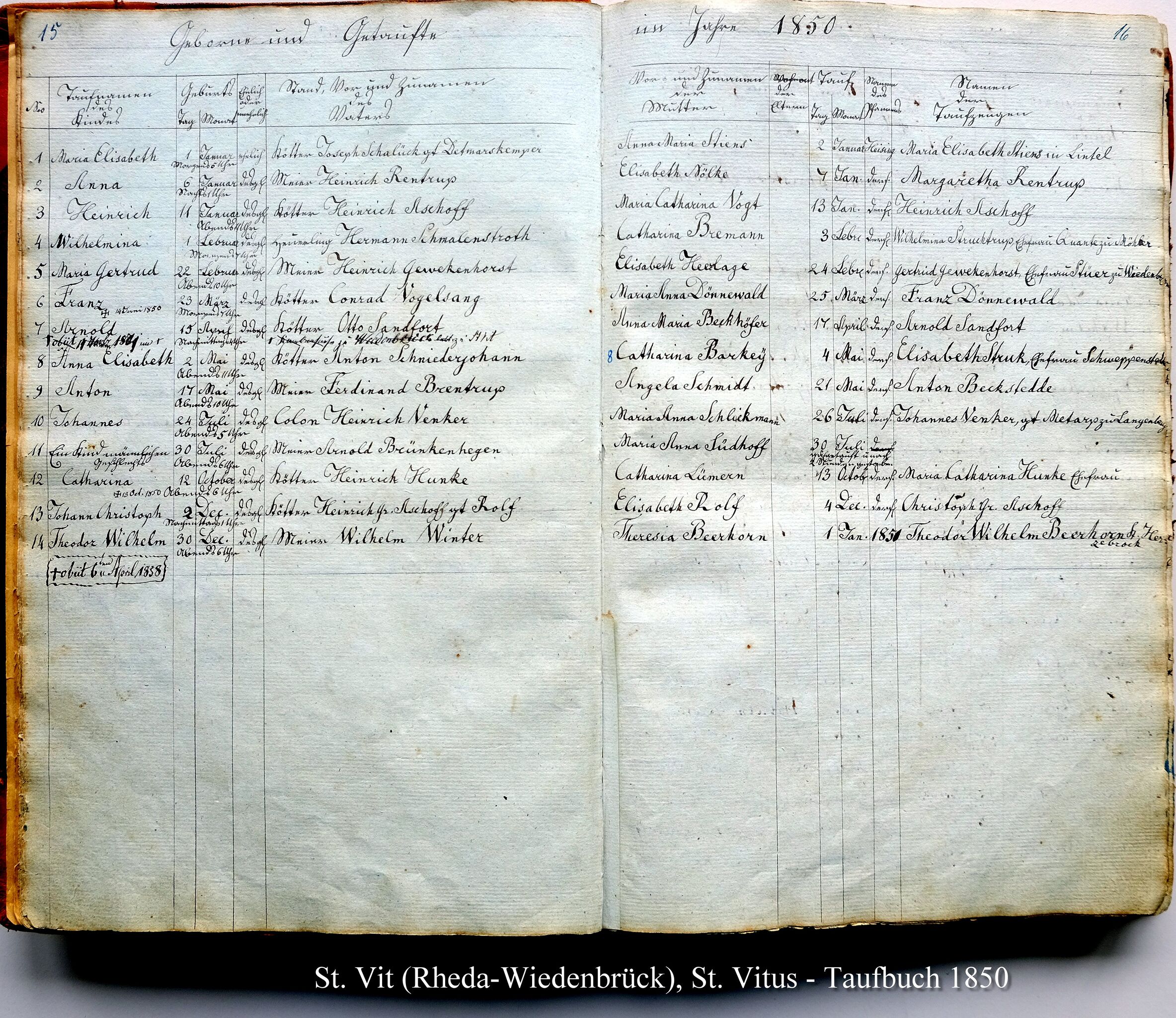 Taufregister von 1850 der kath. Pfarre St. Vitus in St. Vit (Rheda-Wiedenbrück)