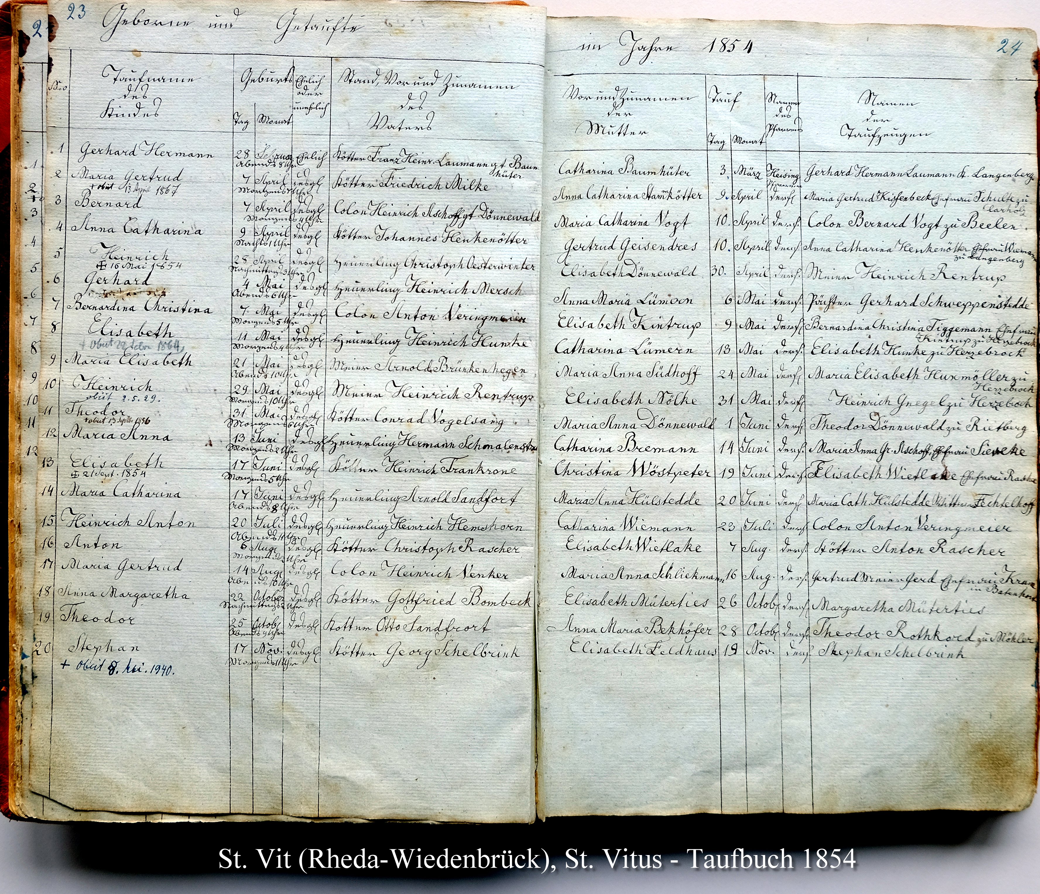 | aktuell | 06:55, 14. Jun. 2018 | 3.553 × 3.053 (2,69 MB) | KlausErdmann (Diskussion • Beiträge) | {{Information |Beschreibung = ;Taufregister von 1854 der kath. Pfarre St. Vitus in St. Vit (Rheda-Wiedenbrück) |Quelle = |Urheber = K.Erdmann ''(Repro: Juni 2018)'' |Datum = |Scans = |Genehmigung = {{self|Cc-by- |