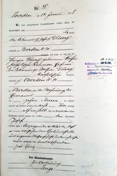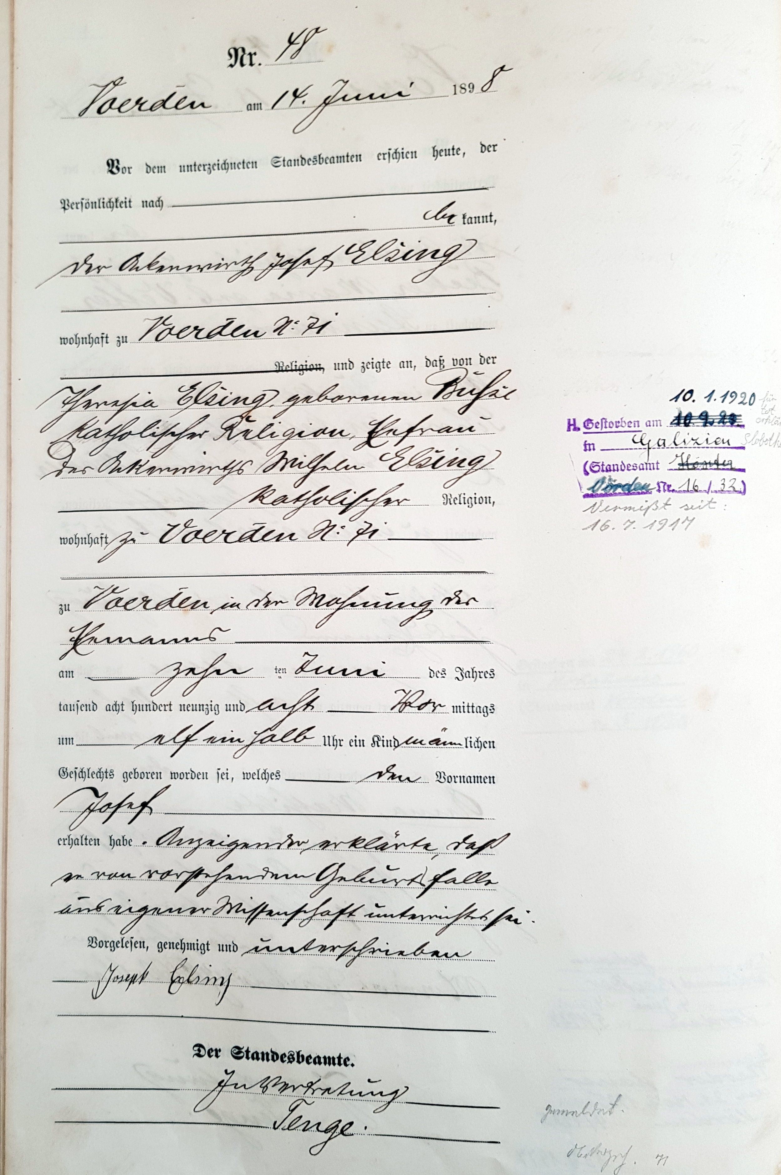 Standesamt Voerden, Geburtsurkunde-Nr.48/1898