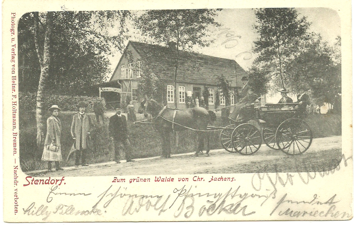 Postkarte aus Stendorf mit Hof Nr. 18, Gasthof "Zum grünen Walde" von Chr. Jachens |