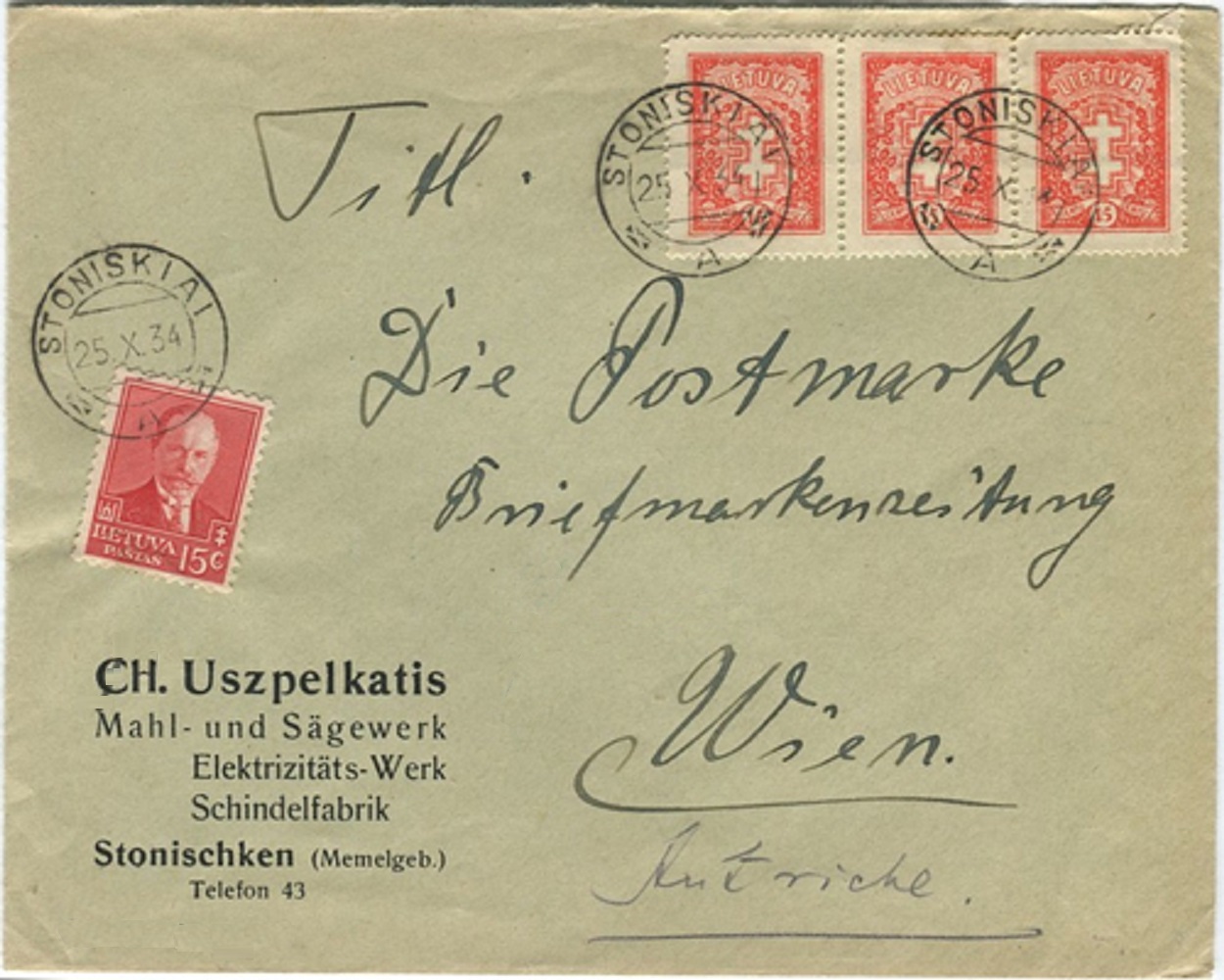 Brief aus Stonischken, Memelland, verschickt nach Wien |