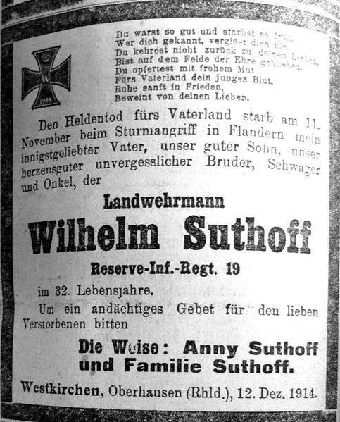 | aktuell | 06:36, 21. Mai 2021 | 1.138 × 1.411 (267 KB) | KlausErdmann (Diskussion • Beiträge) | {{Information |Beschreibung = ;Todesanzeige vom Landwehrmann '''Wilhelm Suthoff''' aus Westkirchen |Quelle = Beckumer Volks-Zeitung 1914 |Urheber = Christine Laumeier |Datum = |Scans = |Genehmigung = {{s |