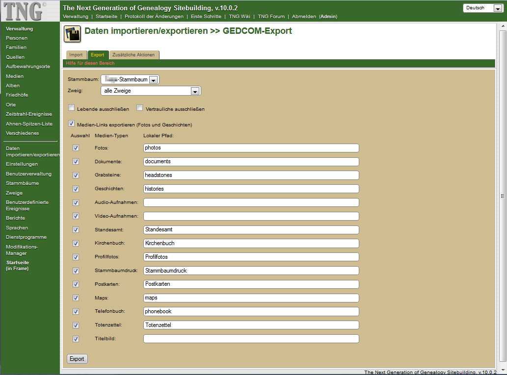 | aktuell | 23:12, 9. Jun. 2014 | 1.033 × 765 (98 KB) | Ojay (Diskussion • Beiträge) | {{Information |Beschreibung = Kategorie:Genealogiesoftware Kategorie:Open Source Kategorie:Genealogiesoftware Web Interface |Quelle = v10.0.2 |Urheber = http://tngsitebuilding.com |Datum = 20140610 |Scans = |Genehmigung = |Andere_Versionen |