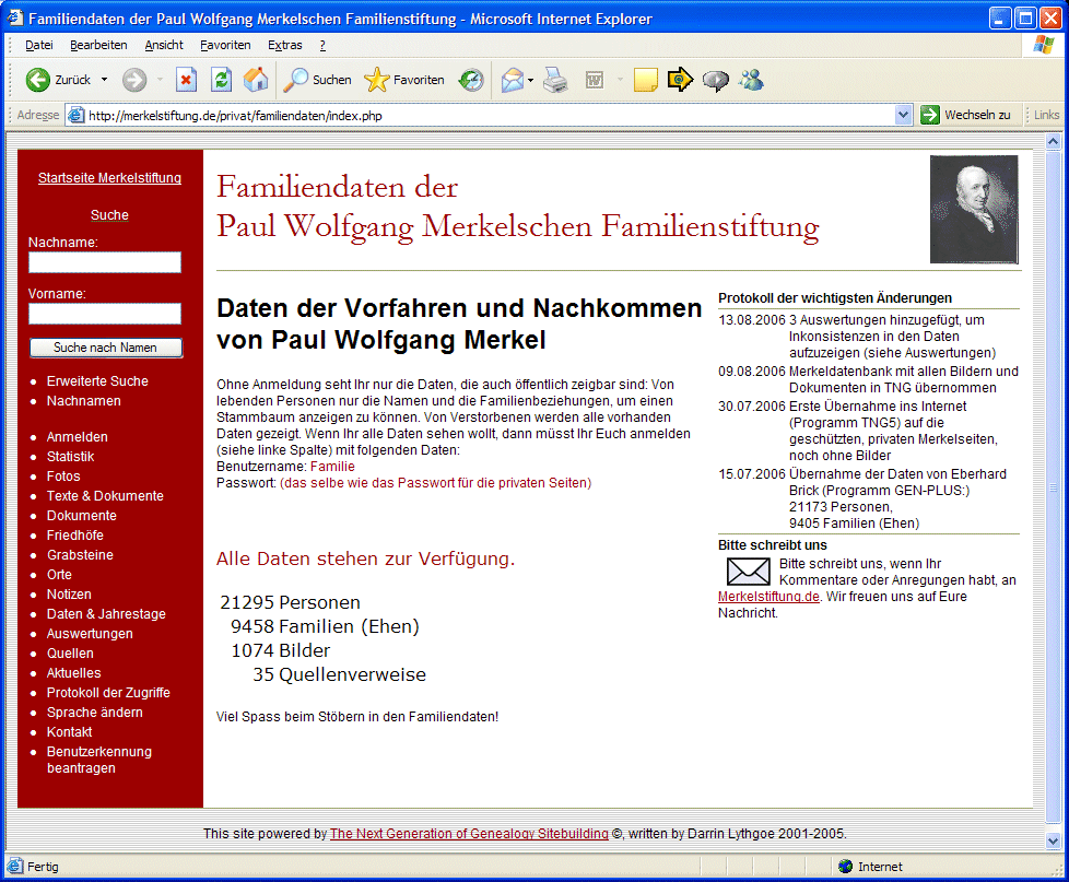 Startseite der Genealogie-Seiten der Merkelstifung mit Software TNG