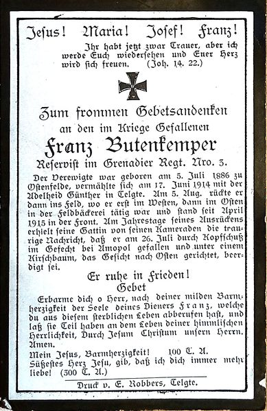 Totenzettel des Reservist Franz Butenkemper aus Ostenfelde