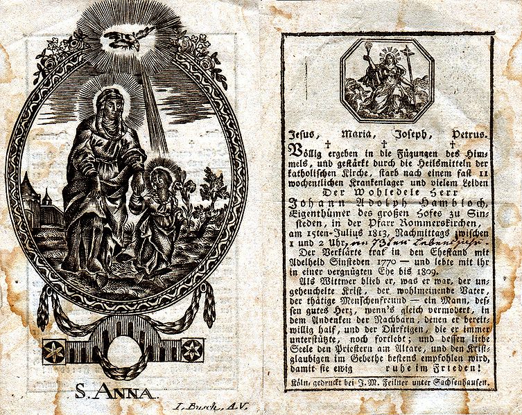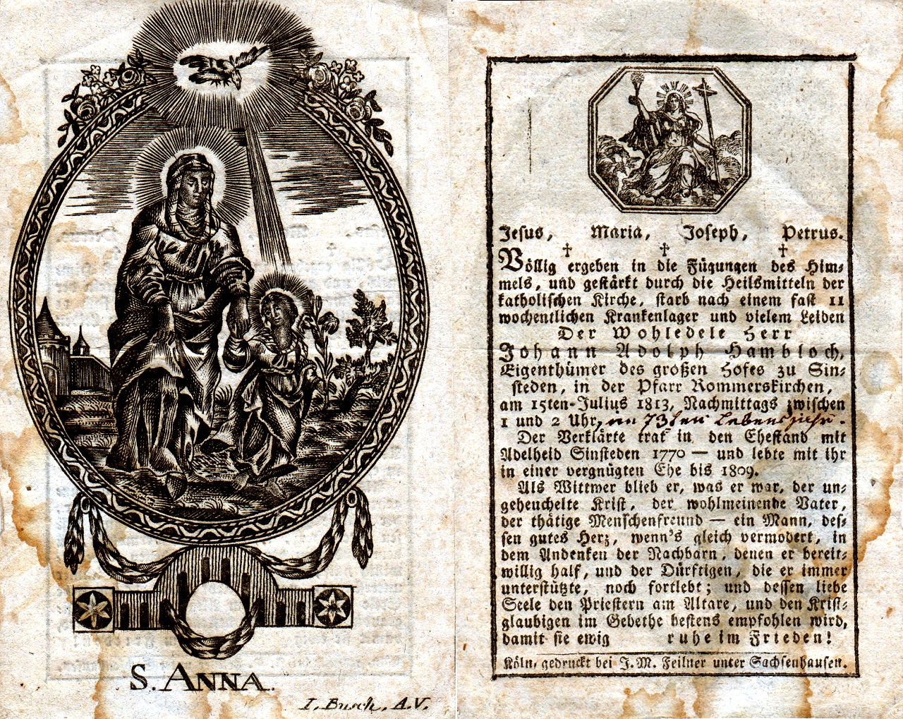 Totenzettel von Johann Adolph Hambloch aus Sinsteden